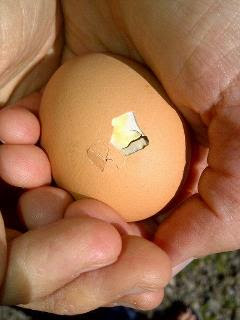 Quick note from the hen house, for those who care about the wee drama of my small flock. I've been keeping an eye on Pauline, aka Ms. Broody, and yesterday I caught her off the nest for a moment. I took advantage of her absence to check on her three adopted eggs, and saw this:
